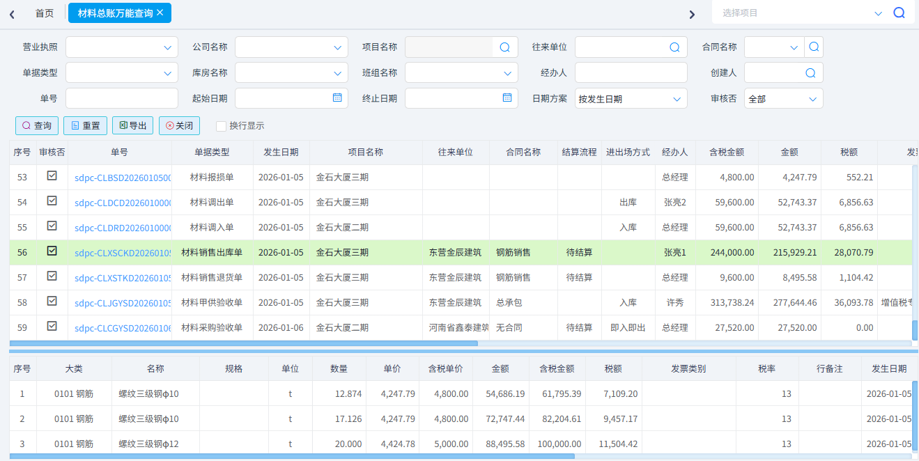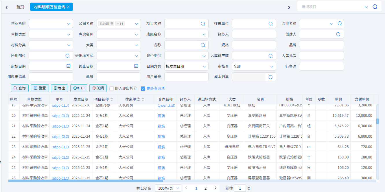 查詢所有類型的材料單據(jù)。一般用于材料單據(jù)的對(duì)賬。可以按照單據(jù)類型、項(xiàng)目名稱、供應(yīng)商、材料名稱、時(shí)間等條件進(jìn)行篩選。可以導(dǎo)出excel表格。