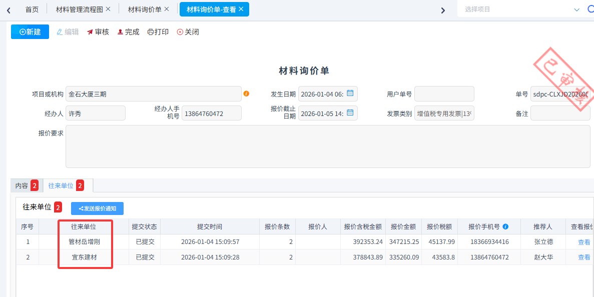 材料詢價(jià)單審批完成之后可以自動(dòng)發(fā)送短信給供應(yīng)商,供應(yīng)商根據(jù)短信提示直接在金石報(bào)價(jià)平臺(tái)進(jìn)行報(bào)價(jià)。