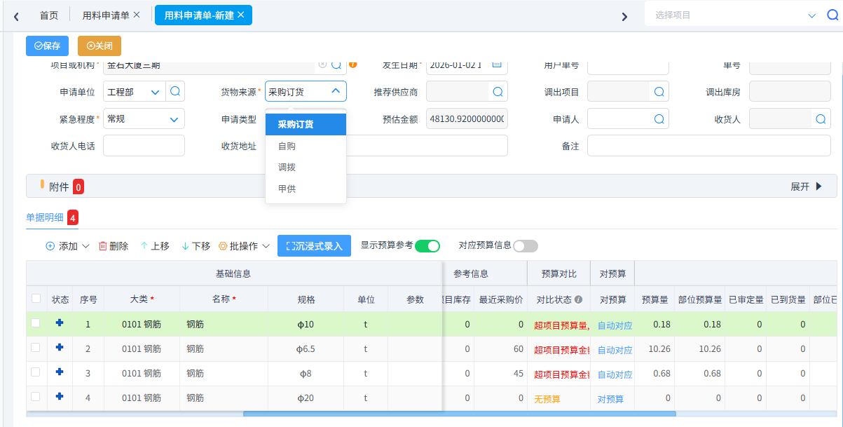 首先由項(xiàng)目現(xiàn)場(chǎng)施工員根據(jù)工程進(jìn)度填寫用料申請(qǐng)。申請(qǐng)材料明細(xì)可以從工料機(jī)預(yù)算中調(diào)取,超出預(yù)算時(shí)系統(tǒng)會(huì)進(jìn)行預(yù)警,當(dāng)購(gòu)買的材料跟預(yù)算不一致是還可以手動(dòng)對(duì)應(yīng)預(yù)算。在用料申請(qǐng)單還可以選擇貨物來(lái)源,選擇采購(gòu)訂貨、自購(gòu)、調(diào)撥、甲供。其中選擇采購(gòu)訂貨可以生成采購(gòu)訂貨單和采購(gòu)合同一般用于大宗采購(gòu)或者集采。選擇自購(gòu)可以直接生成采購(gòu)訂貨單,一般用于零星采購(gòu)或者項(xiàng)目部直接采購(gòu)。調(diào)撥用于申請(qǐng)項(xiàng)目調(diào)撥材料使用,后續(xù)可以生成材料調(diào)出單。甲供用于申請(qǐng)甲供材料,后續(xù)可以生成材料甲供驗(yàn)收單。