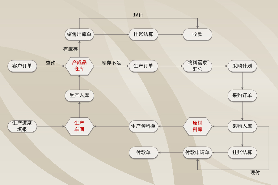 生產(chǎn)管理主要管理由客戶訂單下達(dá)生產(chǎn)計(jì)劃、生產(chǎn)車間領(lǐng)料、生產(chǎn)工序交接、生產(chǎn)進(jìn)度填報(bào)、生產(chǎn)退料、生產(chǎn)入庫等。