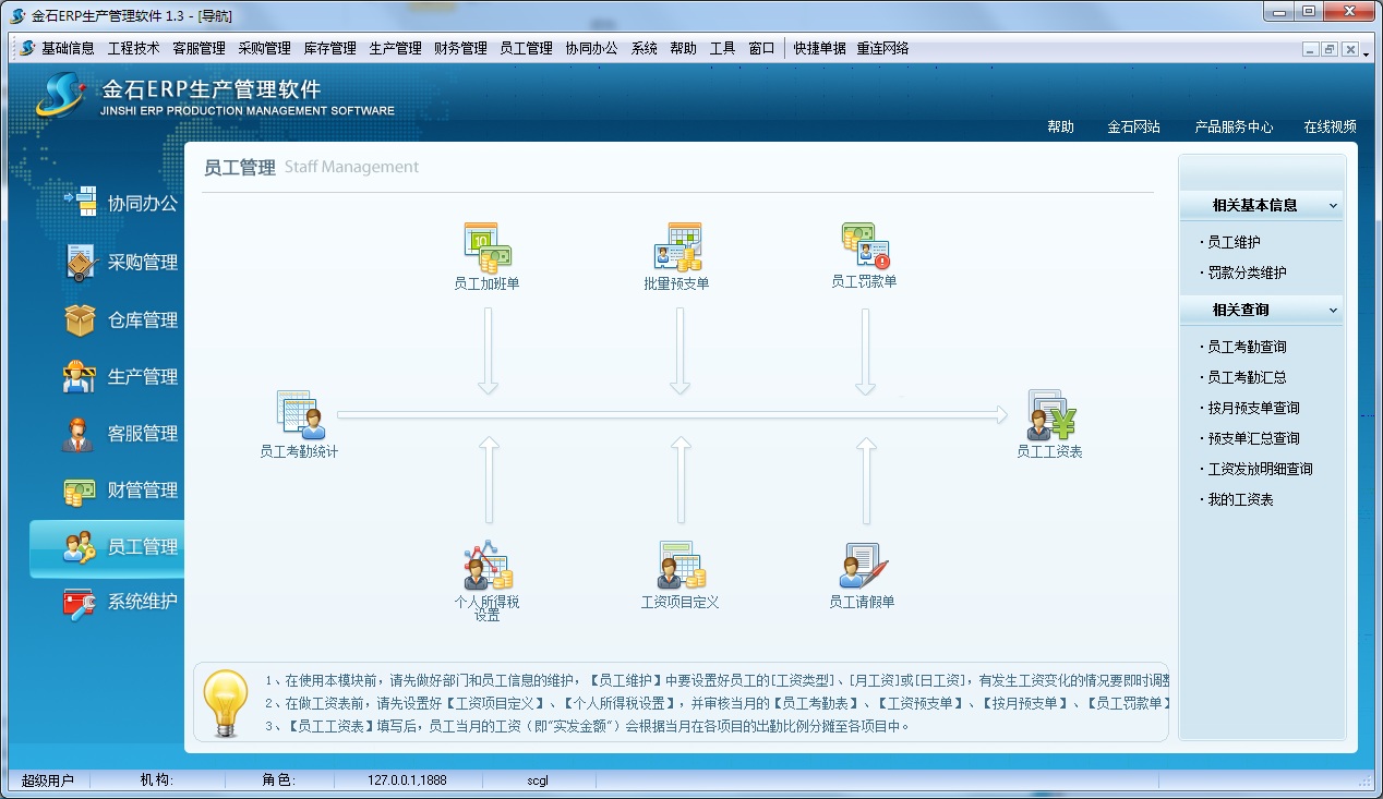 員工管理主要管理人員檔案、員工考勤、員工加班請(qǐng)假、員工預(yù)支、員工罰款最后生成工資表的過程。