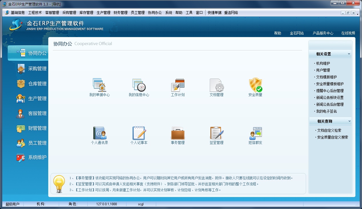 協(xié)同辦公主要管理文檔資料存檔、新聞公告、簽呈、信息中心、單據(jù)中心、工作計(jì)劃等業(yè)務(wù),可以作為OA管理軟件使用。