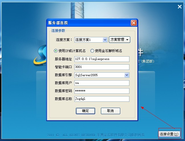 軟件安裝完成后網(wǎng)絡(luò)版要配置連接方案,在登陸界面點(diǎn)連接設(shè)置如下圖: