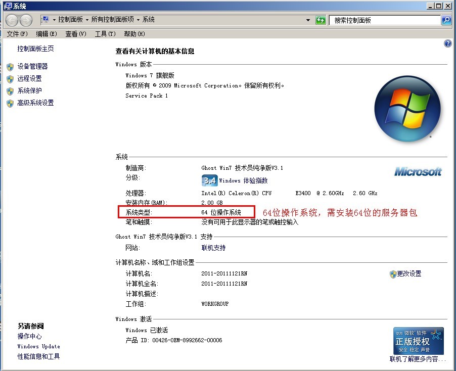 注:查看操作系統(tǒng)的方法如下:用鼠標(biāo)右鍵點(diǎn)擊桌面上我的電腦。在彈出的窗口中可以看到操作系統(tǒng)是32位還是64位