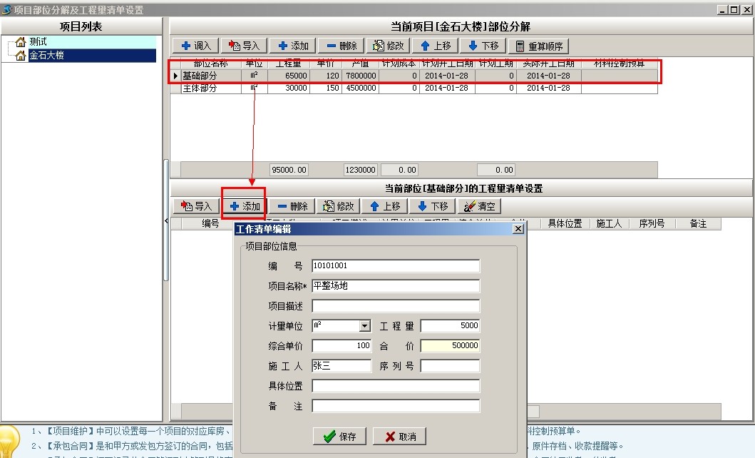 選中項(xiàng)目,點(diǎn)當(dāng)前項(xiàng)目部位分解的添加,彈出添加窗口,填寫部位名稱、工程量、單位等相關(guān)信息,多個部位需要多次添加。也可以使用簡單方法,做好EXCEL電子表格,導(dǎo)入