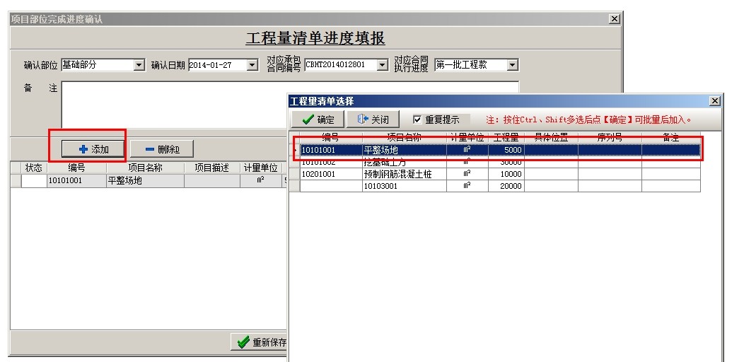 選中相應(yīng)的項(xiàng)目,點(diǎn)擊新建,填出工程量進(jìn)度填報(bào)窗口,選擇部位名稱,可以選擇關(guān)聯(lián)項(xiàng)目對應(yīng)的承包合同號和承包合同執(zhí)行進(jìn)度,然后點(diǎn)添加,調(diào)入清單內(nèi)容,在本次完成量處輸入已完成的工作量,不限制錄入進(jìn)度填報(bào),直至清單工作量完成,調(diào)入下一項(xiàng)清單內(nèi)容(如某項(xiàng)清單實(shí)際工程量超過清單預(yù)算量,可以繼續(xù)填報(bào))